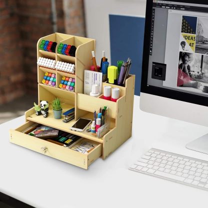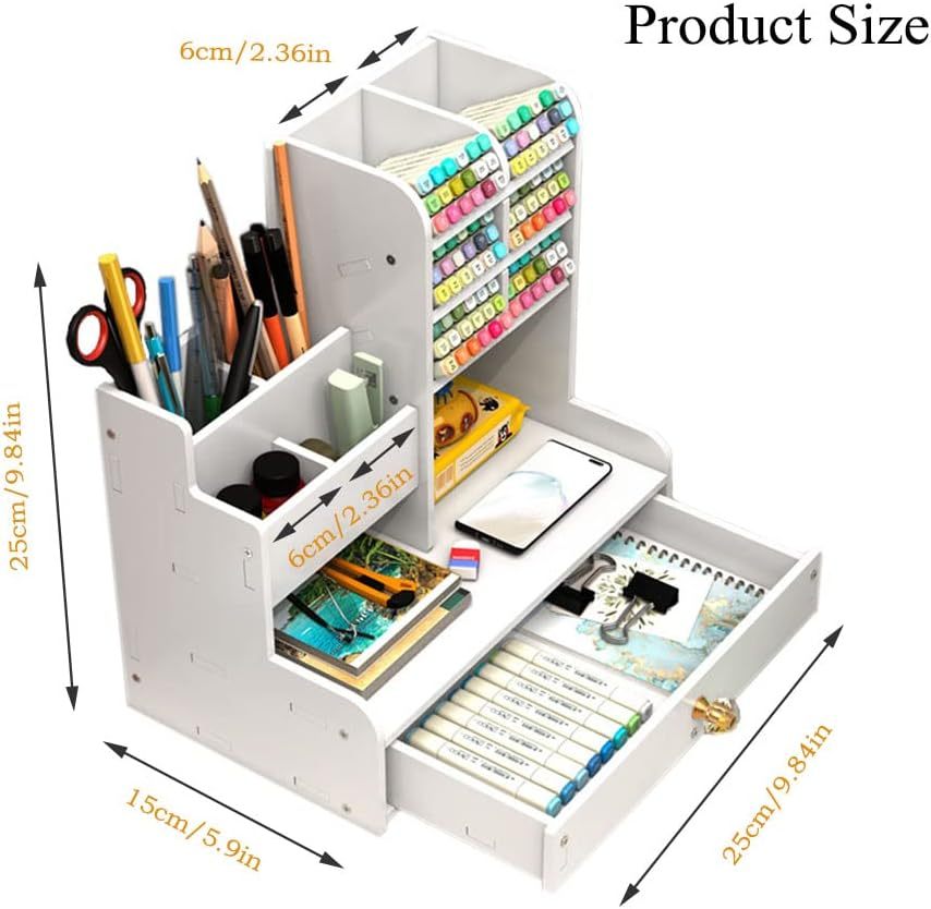 White Desk Organiser with Drawer Multifunctional Pen Holder Tidy Caddy Stationery Desktop Organiser for Home, Office and School (PB17-White)