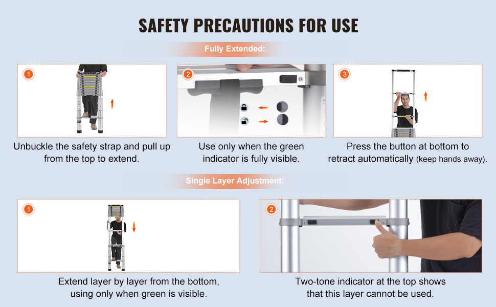 The ladder can be fully extended or adjusted to single levels. Different extension forms require different operating methods, so make sure the buttons are locked during use to prevent accidents.